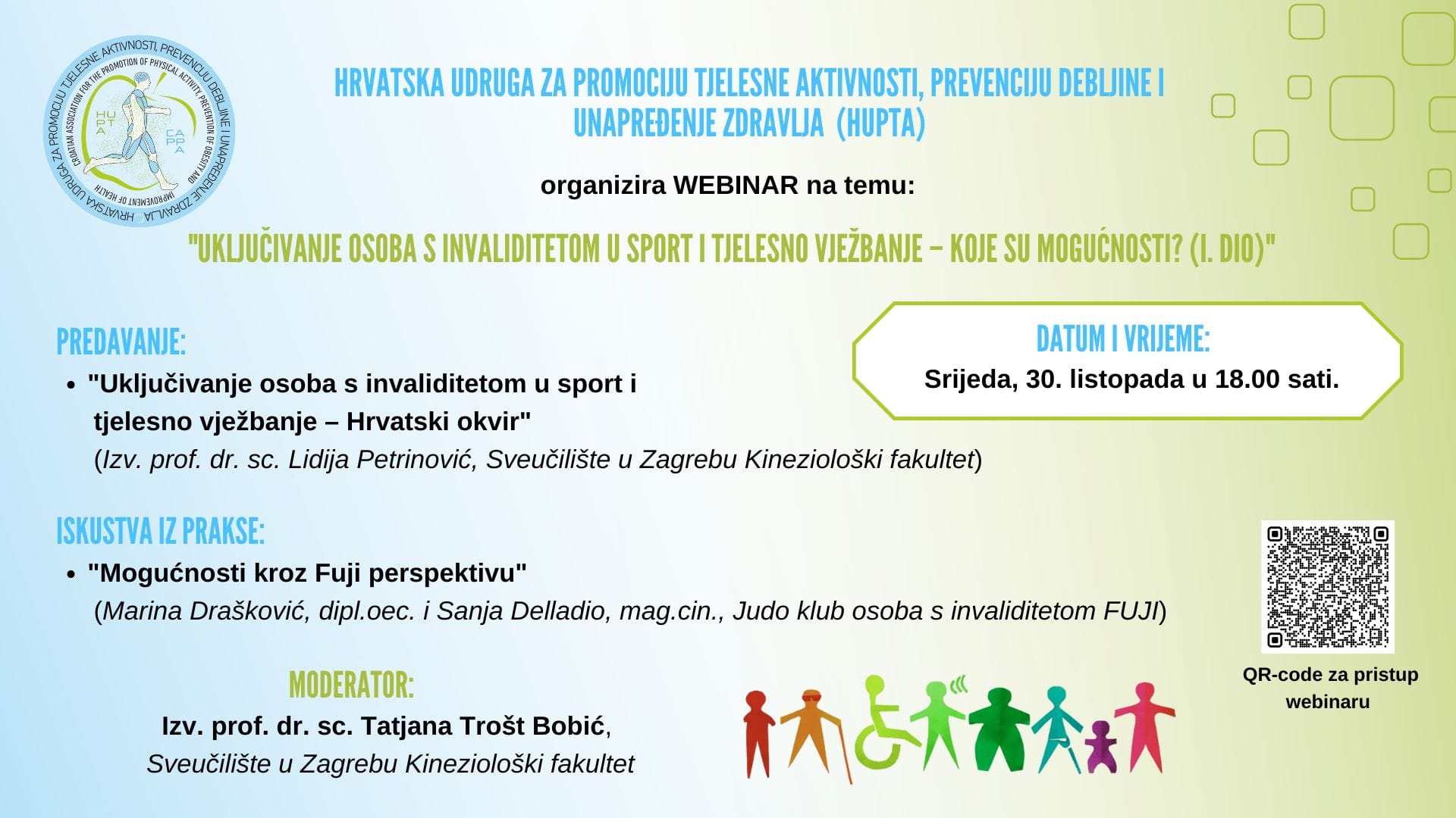 Pozivamo sve zainteresirane da se pridruže novom događaju udruge HUPTA, ovoga puta u obliku webinara na temu: „Uključivanje osoba s invaliditetom u sport i tjelesno vježbanje – koje su mogućnosti? (I. dio)".